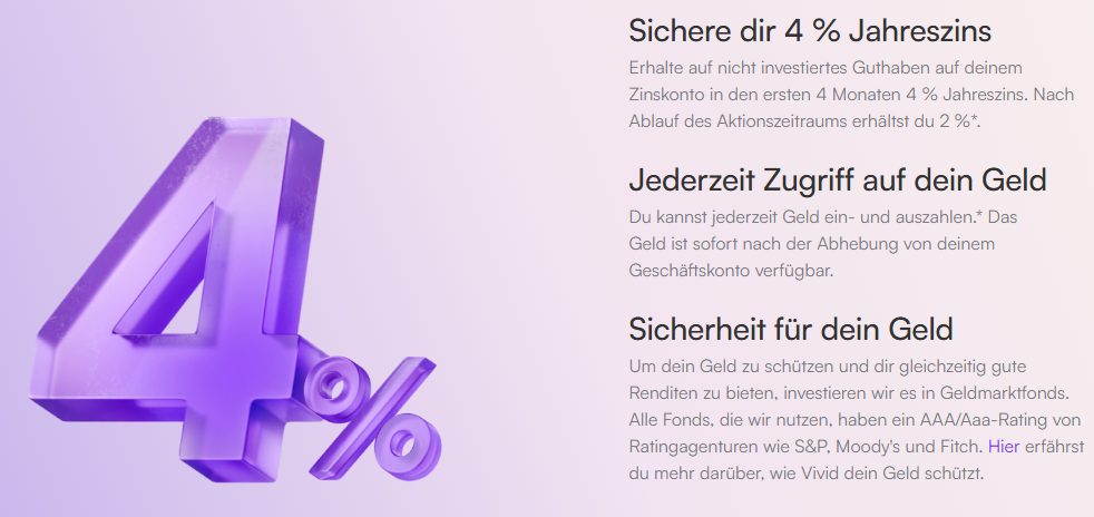 Vivid bietet die Möglichkeit, Geld verzinst zu parken. Für kurzfristige Liquidität ist das durchaus interessant. Wichtig ist allerdings, dass man versteht, welches Produkt man nutzt und dass Zinsen und Konditionen nicht dauerhaft gleich bleiben.