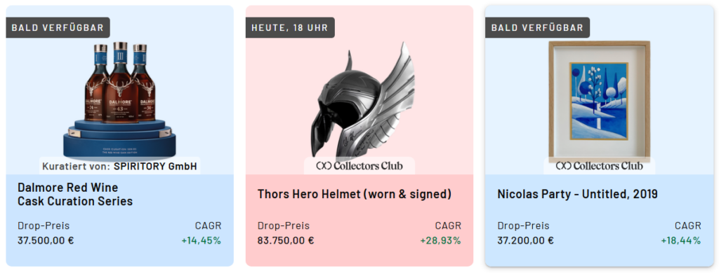 Direkt auf der Startseite siehst du die aktuellen „Drops“, also neue Investment-Möglichkeiten. Zu jedem Asset werden auf einen Blick die wichtigsten Infos angezeigt: